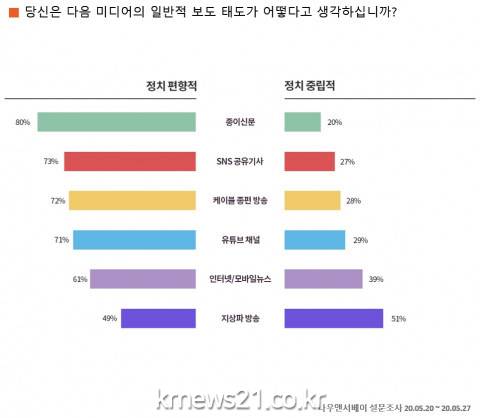 ‘당신은 다음 미디어의 일반적 보도 태도가 어떻다고 생각하십니까?’에 대하여 질문한 결과 정치 편향성이 가장 높게 나타난 미디어는 ‘종이 신문(80%)’이었으며, 다음으로 ‘SNS 공유 기사(73%)’, ‘케이블 종편 방송(72%)’, ‘유튜브 채널(71%)’, ‘인터넷/모바일 뉴스(61%)’, ‘지상파 방송(49%)’ 순으로 나타났다.