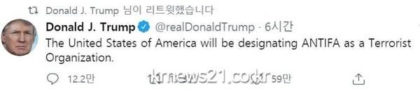 ▲ [트럼프 미국 대통령 트윗]백인 경찰관의 가혹행위로 흑인 남성이 사망한 것과 관련해 미 전역으로 시위가 번지자 도널드 트럼프 미국 대통령이 시위의 배후로 극좌파인 '안티파(Anrifa)'가 있다고 규정짓고 이를 테러조직으로 지정하겠다고 선언했다.