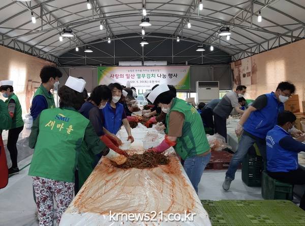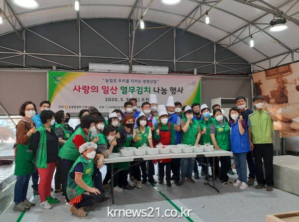 이 날 농협중앙회 고양시지부(지부장 김재득), (사)한국농업경영인고양시연합회(회장 노호영), 고양시 새마을부녀회(회장 오춘희), 고양시 농수산물종합유통센터(사장 현병찬)가 힘을 모아 열무 수확부터 열무김치 담그기까지 구슬땀을 흘렸다. 정성껏 담근 열무김치는 관내 3개 복지관을 통해 소외계층 500가구에 전달해 봉사자들의 따듯한 마음을 전했다.