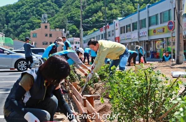 이번 행사는 100여명의 주민들이 함께 참여해 장성중앙시장 앞 주차장 공터에 화살나무 및 백일홍 식재, 화단도색 등 봄꽃과 나무를 식재해 코로나19로 지친 주민들에게 아름다운 화단을 선물했다.