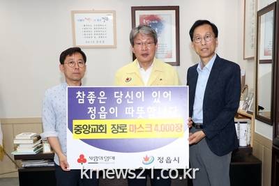 ▲ [사진제공 = 정읍시]정읍중앙교회 양영기, 김태준 장로가 9일 정읍시청을 방문해 코로나 19 예방 마스크 4,000장을 전달했다.