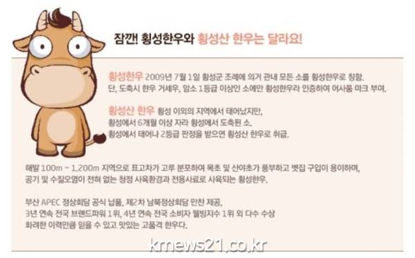 횡성군은 1995년 횡성한우 명품화사업 기본계획을 수립 추진하여 1999년 강원한우경진대회 고급육 부문 최우수상, 2004년 축산물브랜드경진대회 최우수상을 시작으로 2005년부터는 각종 대회에서 대상을 휩쓸었고, 지금까지 1위의 타이틀을 놓치지 않고 굳건히 지키고 있다.