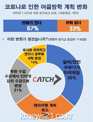 설문조사 결과에 따르면 먼저 코로나19 사태로 인해 여름방학 계획에 변화가 생겼는지 묻는 항목에 ‘변화가 있다’는 답변이 67%(969명)로 과반수를 넘었으며, ‘변화가 없다’는 33%(484명)였다. 이번 여름방학은 기존 여름방학보다 1주일 이상 밀리는 만큼 기존 계획이 바뀔 수밖에 없다는 것이 캐치 측의 분석이다.