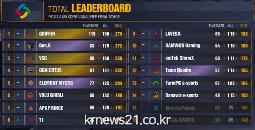 GRIFFIN은 PCS 아시아 채리티 쇼다운에서 14위로 아쉬운 성적을 기록했지만 이번 한국 대표 선발전 파이널 스테이지에서는 초반부터 선두를 달리며 종합 1위로 대회를 마쳤다. VSG는 마지막 날 1 매치에서 치킨을 획득하며 GRIFFIN을 바짝 쫓았고 OGN ENTUS는 3 매치까지 불과 3점 차이로 VRLU GHIBLI(브이알루 기블리)와 출전권을 놓고 다투었지만 막판에 격차를 벌리는 데 성공했다. VRLU GHIBLI는 마지막 매치에서 15위를 기록, 종합 6위에 머물렀다.