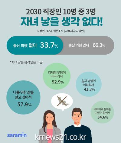 구인구직 매칭플랫폼 사람인(대표 김용환)이 자녀가 없는 2030세대 직장인 712명을 대상으로 ‘자녀 출산 의향’에 대해 조사한 결과, 33.7%가 없다고 답했다.