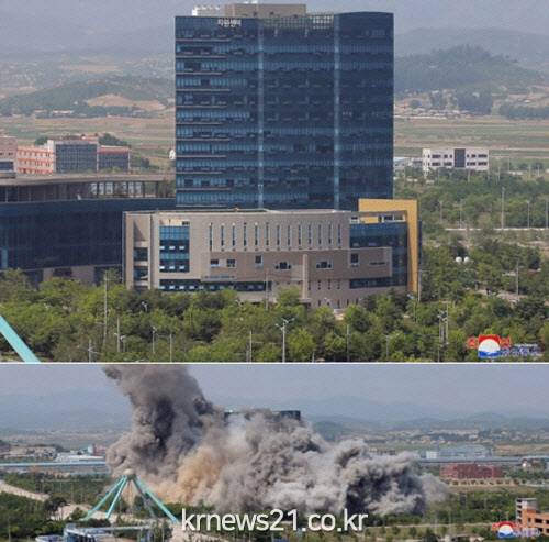 ▲ [16일 폭파된 남북연락사무소/조선중앙통신 홈페이지 캡처]북한이 전날(16일) 판문점 선언의 대표적인 성과이자 '남북화해'의 상징으로 꼽히는 개성 남북공동연락소 건물을 폭파한 지 하루 만인 오늘(17일) 철수했던 비무장지대 감시초소(GP)와 금강산 관광지구 및 개성공단에 군부대 병력을 전개하고 남북 접경지역에서 군사훈련을 재개하겠다고 선언했다. 이는 사실상 9·19 남북 군사합의 파기와 나아가 남북교류의 단절을 의미한다.