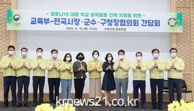 영등포구(구청장 채현일)가 16일 수원시청에서 열린 교육부-전국시장‧군수‧구청장협의회 간담회에 참석해 학교방역 지원 방안을 협의하고, 지역 내 유치원과 학교에 방역인력을 전격 투입하기로 결정했다.
