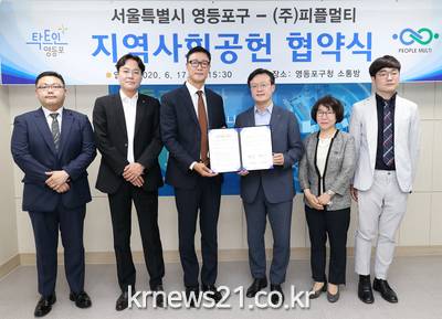 지난 17일 채현일 영등포구청장은 ㈜피플멀티 조군수 회장 및 박훈웅 대표를 비롯한 기업 관계자들과 함께 업무협약식을 갖고, 협약서에 서명하며 지역 어르신 복지 향상을 위한 결의를 다졌다.