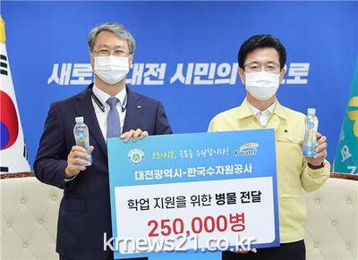 이날 전달식에서 한국수자원공사는 코로나19 극복을 위해 대전시에 약 25만병의 ‘케이워터(K-WATER) 병물’을 지원하기로 하고, 시는 코로나19 감염 우려로 교내 정수기 사용이 곤란한 학생들을 고려해 이를 각 학교에 공급하기로 했다.