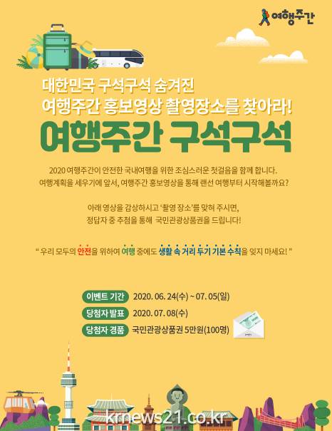 여행주간 누리집과 누리소통망에서는 다양한 온라인 행사도 이어진다. ▲ ‘여행주간 구석구석’ 이벤트에서는 여행주간 영상 관련 퀴즈를 맞히면 추첨을 통해 100명에게 국민관광상품권을 증정한다. ▲ ‘나만의 비대면 일상 기념 여행’ 이벤트에서는 개인 누리소통망(SNS)에 비대면 여행 경험을 게시글로 작성하고 여행주간 누리소통망에 댓글로 올리면 1,000명을 추첨해 국민관광상품권과 외식상품권 등 경품을 증정한다. ▲ ‘여행주간 여행룰렛’ 이벤트에서는 즉석 추첨을 통해 753명에게 호텔 숙박권과 커피교환권 등을 증정한다.
