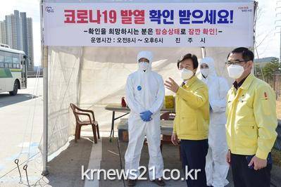 한편, 진주시는 지난 2월 21일 관내에서 코로나19 확진자 2명의 발생과 동시에 더 이상의 지역 확산을 차단하기 위해 고속터미널, 시외버스터미널, 진주역 등 대중교통 시설을 중심으로 고속도로 IC 3개소와 농산물도매센터 등에서 발열체크 부스를 설치하고 열화상 카메라 3대를 투입해 발열체크를 실시해왔다.