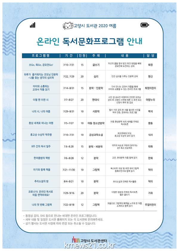 고양시(시장 이재준) 도서관센터가 코로나19 상황이 지속되는 가운데 시민들을 위한 비대면 독서문화프로그램인 온라인 독서 프로그램을 풍성하게 마련했다.