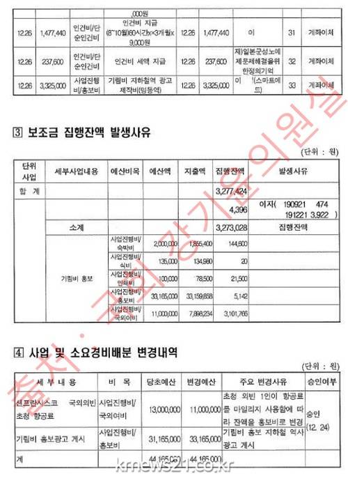 ▲ [자료제공 = 강기윤 의원]후원금 사적 운용 등 회계 투명성 문제로 논란을 빚고 있는 정의기억연대(정의연)가 서울시로부터 지원받은 보조금 중 일부를 간식비, 커피 구매비 등 그 목적과 다르게 쓴 것으로 드러났다.