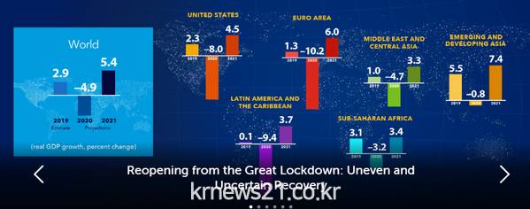 기타 고피나스 IMF 수석 이코노미스트는 이날 원격 기자회견에서 "우리는 아직도 (코로나19)숲에서 빠져나오지 못했다"며 "'대봉쇄'(Great Lockdown) 경기침체에서 탈출하지 못했다"고 분석했다. 그는 "어마어마한 불확실성을 고려할 때 정책결정권자들은 계속 경계를 기울여야 한다"고 경고했다.