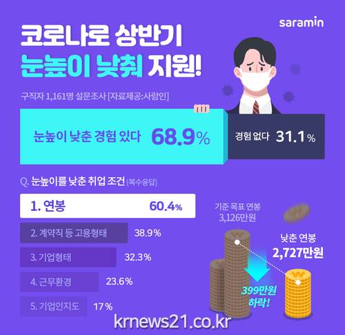 ▲ [자료제공 = 사람인]신종 코로나바이러스감염증(코로나19) 사태로 사상 최악의 취업 한파가 몰아치면서, 상반기 취업 전선에 뛰어든 구직자 10명 중 7명은 눈높이를 낮춰 지원한 것으로 나타났다.