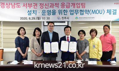 ▲ [사진제공 = 진주시]진주시는 29일 오전 10시 30분 시청 상황실에서 경상남도 광역정신건강복지센터와 고위험 정신질환자 24시간 위기대응체계 구축을 위한 경상남도 서부권 응급개입팀 설치ㆍ운영 업무 협약을 체결했다.