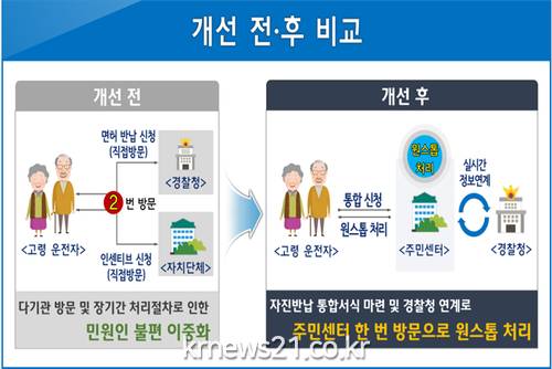 그간 운전면허를 자진반납 후 인센티브 지원신청(선불교통카드 10만 원)을 하기 위해 어르신들이 직접 경찰청과 동주민센터를 이중 방문해야 하는 불편이 있었다. 이러한 불편을 해소하기 위하여 행정안전부는 면허 반납과 지원신청을 동주민센터에서 한 번에 처리할 수 있는 고령운전자 운전면허 자진반납 간소화 서비스를 구축, 8월부터 전국 시행하기로 했다.
