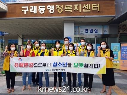구래동 행정복지센터는 최근 코로나19 확산으로 늦어진 청소년들의 등교수업 개시에 따라 지난 1일 청소년 지도위원 및 행정복지센터 직원들과 함께 구래동 상가 밀집지역 중심으로 청소년 유해환경 개선활동을 실시했다.