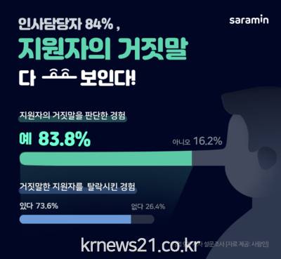 구인구직 매칭플랫폼 사람인(대표 김용환)이 기업 927개사를 대상으로 ‘채용 중 지원자의 거짓말’에 대해 조사한 결과, 83.8%가 지원자의 거짓말을 판단한 경험이 ‘있다’고 답했다.