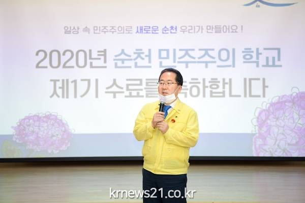 순천시(시장 허석)는 지난 7월 7일 수료생 40명이 참석한 가운데 올해 처음으로 운영한 2020년 제1기 순천 민주주의 학교가 민주주의 디딤돌 셀프 시상식과 함께 수료식을 가졌다.