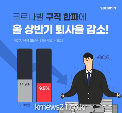 ▲ [자료제공 = 사람인]코로나19로 촉발된 경기 불황과 경영난으로 직장인 10명 중 7명이 이직을 미루는 등 최대한 현 직장을 유지하려는 기조가 강해지고 있다. 실제로 일선 기업들의 올해 상반기 퇴사율은 예년에 비해 낮아진 것으로 나타났다.