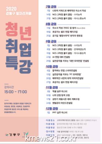7월부터 본격적으로 시작되는 청년취업특강 프로그램은 ▲ 자소서 작성 가이드 및 첨삭 ▲호감가는 셀프 면접 메이크업 ▲ NCS(국가직무능력표준) 고득점 풀이 꿀팁 ▲ 합격하는 면접 스피치컨설팅 등 다양하게 구성되어 있다.