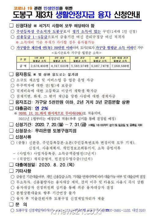 ‘제3차 생활안정자금’ 무이자 융자 지원 신청기간은 7월 20일부터 7월 31일까지이며, 우리은행 도봉구청지점에 신청하면 된다.