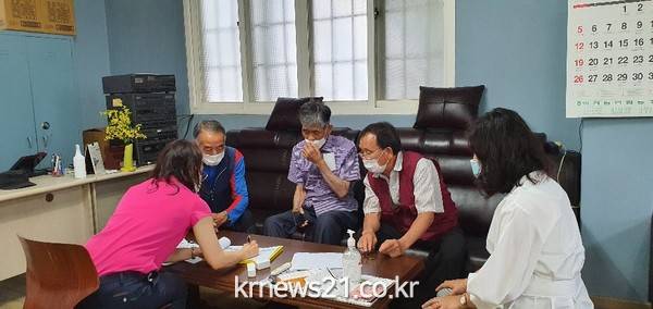 동은 코로나19 집단감염 예방을 위해 회천3동 새마을지회 회원들과 함께 무더위 쉼터에 사전방역을 실시하고 코로나19 방역지침을 전달했다.