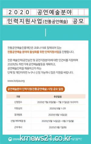 ▲ [사진=홍보포스터]전통공연예술진흥재단(이사장 정성숙)은 코로나19로 침체되어 있는 전통공연예술분야의 활성화를 도모하기 위해 전통공연예술 분야 인력지원사업을 진행한다.