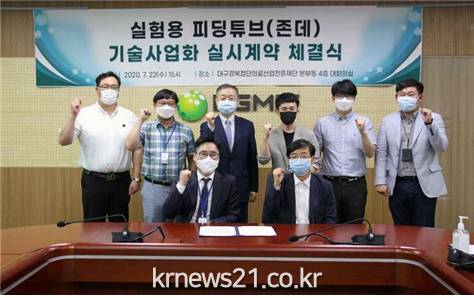 ▲ [사진제공 = 대구광역시]대구경북첨단의료산업진흥재단(이사장 이영호, 이하 ‘재단’)은 일본산 제품이 시장을 장악한 실험동물용 피딩튜브 (Sonde, 경구투여를 위한 관 모양의 실험기구)의 국산화를 위해 22일 ㈜솔메이트(대표 문경수)와 제품상용화를 위한 기술 계약을 체결하고 피딩튜브의 국산화를 지원하기로 했다. 기술료는 제품개발 후 순매출이 1억원을 초과할 경우 순매출액의 10%를 분배하기로 했다.