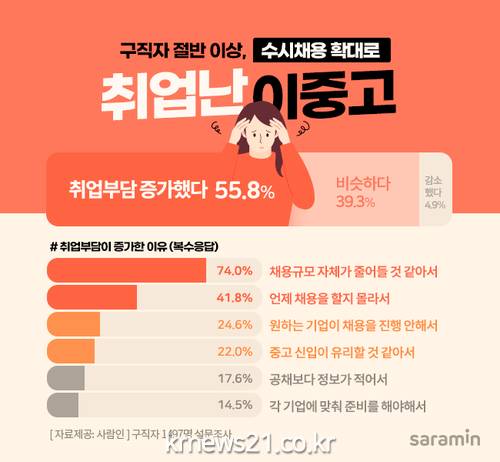 구인구직 매칭플랫폼 사람인(대표 김용환)이 구직자 1,497명을 대상으로 ‘수시채용 부담감’을 주제로 조사한 결과, 절반 이상인 55.8%가 ‘부담감이 증가했다’고 답했다.