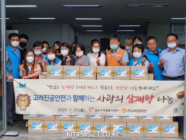 양주시자원봉사센터(센터장 박종성)는 지난 27일 ㈜고려진공안전(대표 김광자)과 함께 관내 취약계층을 위해 사랑의 삼계탕 나눔 행사를 실시했다고 밝혔다.