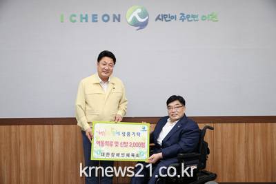 대한장애인체육회(회장 이명호)는 29일 이천시(시장 엄태준)에 아동 의류 및 신발 2천 여 점을 기탁했다.