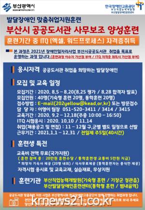 발달장애인 공공도서관 사무보조 과정 교육생은 내일(5일)부터 20일까지 모집한다. 교육 기간은 9월 2일부터 12월 18일까지 4개월이다. 희망자는 부산발달장애인훈련센터(☎051-520-3440)로 문의하면 된다.