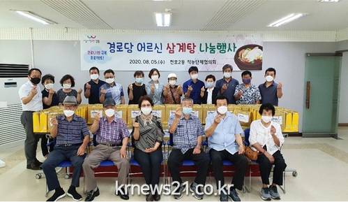 ▲ [사진제공 = 강동구]강동구(구청장 이정훈) 천호2동이 지난 5일 코로나19 상황과 무더위에 지친 경로당 어르신을 위해 ‘경로당 어르신 삼계탕 나눔행사’를 열었다.