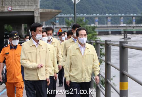 정세균 국무총리가 8일 집중호우 피해로 특별재난지역으로 선포한 충남 아산을 찾아 “피해 복구가 최대한 빨리 이뤄지도록 모든 지원을 아끼지 않겠다”고 밝혔다.