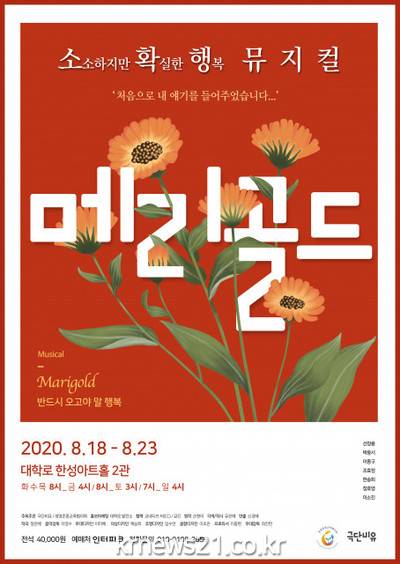 두 단체가 공동 주최하고 코네티브 씨(CC)와 금진이 협력하는 소확행 뮤지컬 <메리골드>는 8월 18일(화)부터 23일(일)까지 대학로 한성아트홀에서 공연될 예정이다.