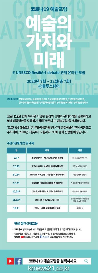 문체부는 지난 7월부터 예술 분야 기관 7곳과 함께 ‘코로나19 예술포럼’을 12월까지 총 7회 연속으로 개최하고 있다. 이 토론회는 유네스코가 제안한 ‘예술의 회복력 운동’(리질리아트 무브먼트, ResiliArt movement)과도 연계해 진행한다.