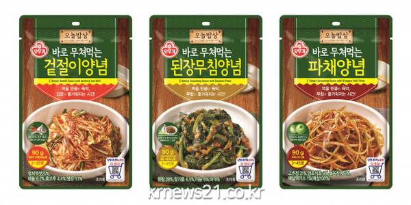 오뚜기는 간편하면서도 맛있는 채소 무침을 위한 ‘오늘밥상 무침양념’ 3종을 출시했다며 겉절이, 된장무침, 파채 무침 등 요리 초보도 맛 내기 번거로운 무침 요리를 쉽고 간편하게 만들 수 있을 것이라고 밝혔다.