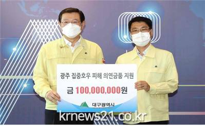 ▲ [사진제공 = 대구광역시]김정기 대구시 기획조정실장이 18일 광주시청을 찾아 이번 장마철 집중호우와 태풍으로 많은 재산 피해를 입은 광주시민들을 위로하기 위해 의연금품 1억원을 전달했다.