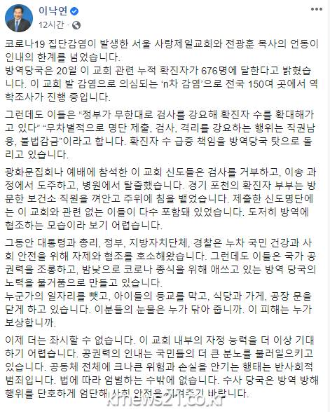 ▲ [이미지출처 = 이낙연 총리 페이스북 캡처]이낙연 더불어민주당 당대표 후보가 신종 코로나바이러스 감염증(코로나19) 방역을 방해하고 있는 전광훈 목사와 사랑제일교회에 대한 수사당국의 엄정수사와 엄벌을 촉구했다.