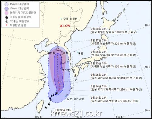 이 태풍은 25일 제주도 남쪽 해상으로 북상해 26일 제주도 서쪽을 지나 서해상으로 이동한 뒤 27일 황해도에 상륙할 것으로 예상된다.