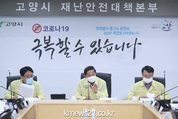 이재준 고양시장은 23일(일요일) 08:30 고양시 재난상황실에서 긴급 재난대책본부 회의를 주재하고 대중교통 비말차단용 투명비닐막 설치를 비롯 생활 속 코로나19 예방대책과 일반·휴게음식점 업주들의 적극적인 동참을 당부했다.