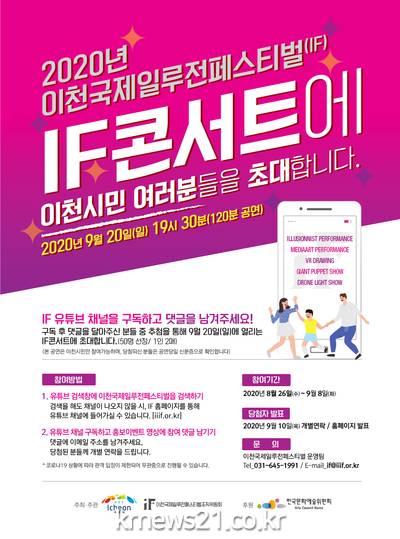 세계 최고의 일루셔니스트들의 화려한 공연과 5G, AR, VR 시연 등 다양한 부대행사를 망라한 글로벌 페스티벌로 선보일 계획이었던 이천국제일루전페스티벌은 최근 수도권을 중심으로 광범위하게 확산되는 코로나-19의 전염 위기 경보가 이어짐에 따라 주요 공연팀을 국내 일루셔니스트들로 구성하고 유튜브, 네이버 TV 생중계 등 디지털 가상시대에 부합한 온라인 페스티벌로 진행하기로 결정한 바 있다.