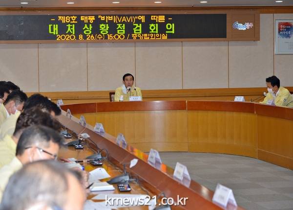충주시는 지난 26일 오후 3시 중앙탑회의실에서 제8호 태풍 ‘바비’ 북상에 따른 긴급 점검회의를 개최하고 대비태세 만전에 집중하고 있다.
