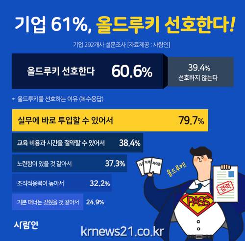 구인구직 매칭플랫폼 사람인(대표 김용환)이 기업 292개사를 대상으로 ‘올드루키 선호도’에 대해 조사한 결과 60.6%가 선호한다고 답했다.