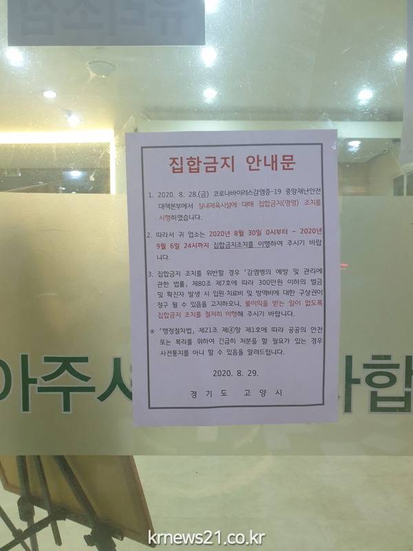 고양시 일산서구(구청장 명재성)는 지난 8월 31일 관내 미신고체육시설 집합금지 행정명령 조치 실시에 따른 일산서구 관내 미신고 실내체육시설에 대해 추가로 89개소를 지정해 행정명령 안내문을 신속히 전달·계도 안내했다.