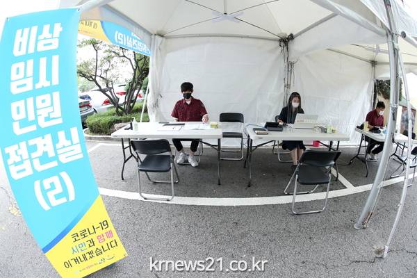 현재 코로나19 방역수칙이 사회적 거리두기 2.5단계로 상향됐고 시청사를 찾는 민원인 중 무증상 코로나19 확진자를 원천적으로 막을 수 없으며, 시청사를 자유롭게 출입하는 배달원 등으로 인한 감염 등이 우려됨에 따라 시는 민원인과 직원 간의 직접적인 접촉을 최소화하기 위한 완충지대로써 임시민원접견실을 설치하게 됐다.