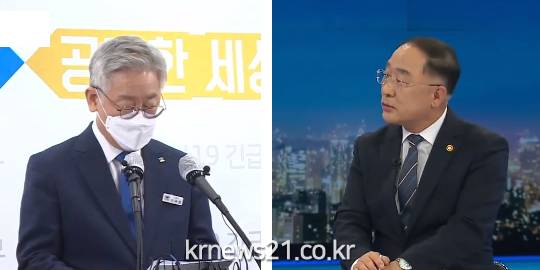 ▲ [사진출처 = TV조선/KBS뉴스 캡처]이재명 경기도지사와 홍남기 경제부총리 및 기재부 장관 사이에 대립각이 섰다. 이재명 경기도지사가 2차 긴급재난지원금을 전 국민 지급해야 한다는 취지의 발언에 대해 홍 부총리가 "책임 없는 발언"이라고 언급하고, 이 지사는 홍 부총리에게 "오만에서 벗어나라"고 대응하면서도.