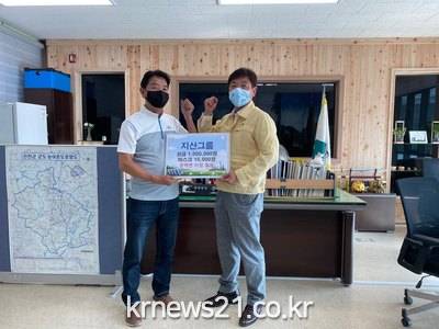 ▲ [사진제공 = 진천군]지산물류그룹(회장 한주식)은 1일 코로나19 극복과 지역 저소득층을 위해 문백면행정복지센터를 방문해 성금 100만원과 마스크 1만장을 기탁했다.